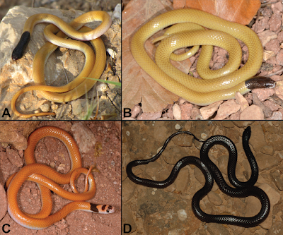 Discussion We identify four species within Rhynchocalamus: R. satunini, R. arabicus, R. melanocephalus, and R. dayanae sp. nov., the latter, to the best of our knowledge, is endemic to southern Israel. The onset of Rhynchocalamus diversification is very old and estimated to have occurred during the Middle Miocene, possibly originating in the Levant region. Radiation probably resulted from vicariance and dispersal events caused by continuous geological instability, sea-level fluctuations and climatic changes within the Levant region.  | Figure 4: Habitus comparisons of Rhynchocalamus taxa. Dorsal view. (A) Rhynchocalamus dayanae sp. nov. (unvouchered specimen; Road no. 40, near Mitzpe Ramon, Negev Mountain, Israel; photo by Simon Jamison); (B) R. melanocephalus (ZMHRU2007-69; Tartus, Syria; photo by Bayram Göçmen); (C) R. satunini (ZMHRU2015/0; Artuklu, Mardin province, Turkey; photo by Bayram Göçmen); (D) R. arabicus (CN4780; Wadi Ayoun, Dhofar Governorate, Oman; photo by Gabriel Martínez). |