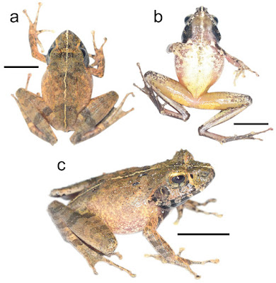 Figure 5. The holotype of Gephyromantis angano sp. n., ZSM 68/2016 (MSZC 0172) in life in (a) dorsal, (b) ventral, and (c) lateral view. Scale bars indicate 10 mm. |