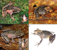 Figure 6. Variation in Gephyromantis angano sp. n. (a) UADBA-A uncatalogued (MSZC 0032), adult male (FGG = 69/56), (b) UADBA-A uncatalogued (MSZC 0053), juvenile, (c) ZSM 67/2016 (MSZC 0021), adult male (FGG = 30/26), (d) UADBA-A uncatalogued (MSZC 0091), adult male (FGG = 57/55), (e) Université d’Antsiranana uncatalogued (MSZC 0088), adult female (not in the type series), (f) ZSM 69/2016 (MSZC 0112), adult female. Insets show specimens in ventral view. Not to scale. |