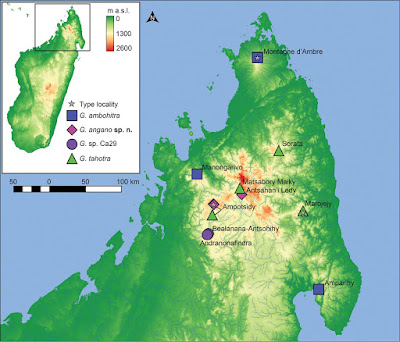 Natural history and distribution: One specimen of this species has been collected in Antsahan’i Ledy, and numerous specimens of this species were encountered during fieldwork on the Ampotsidy mountains (Fig. 7). Calling males were generally found in association with slow flowing water, in the case of the holotype at the source of a spring, in close syntopy with Boophis madagascariensis and a Mantidactylus (Brygoomantis) species. Males called up to 1 m above the ground from fern fronds and other low foliage. Females were found both near to and away from water, during the day and at night, but were less commonly encountered. No eggs were observed, but highly ovigerous females were found in January (e.g. Fig. 6e). The call of the species is loud and carries over long distances, so that it can be heard alongside the calls of Boophis madagascariensis from well outside of some small forest fragments in the vicinity of Ampotsidy. In a small forest fragment where vouchers of Gephyromantis (Asperomantis) tahotra were collected (1368 m a.s.l.), G. angano sp. n. could also be heard; this appears to be the first ever record of any two Asperomantis species occurring in close syntopy (Vences et al. 2017).