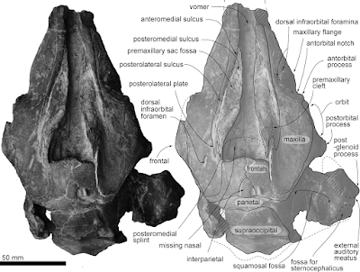 Fig 2. Skull, Urkudelphis chawpipacha MO-1 (holotype) in dorsal view. Left, photo, right, line art. |