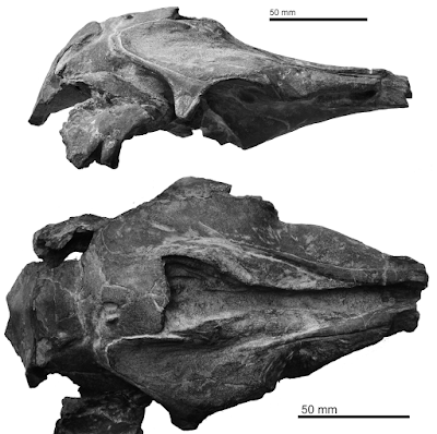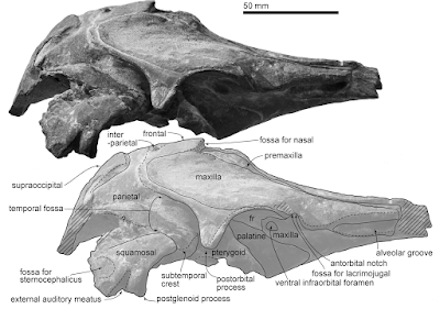 Fig 4. Skull, Urkudelphis chawpipacha MO-1 (holotype) in right lateral view. Upper, photo, lower, line art. |