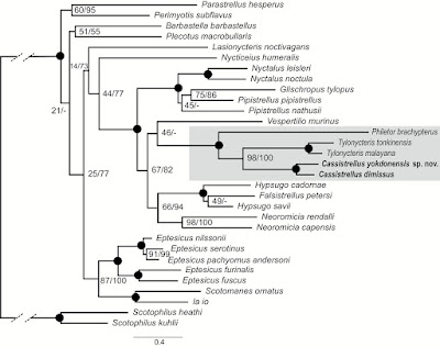 | Fig. 1. Maximum likelihood (ML) phylogeny of selected Vespertilioninae bats based on a combined alignment of 2 mitochondrial and 1 nuclear gene (2,161 bp in total). Numbers near nodes indicate branch support (left, percent ML bootstrap, right, posterior probability), while solid circles represent nodes recovered in >98% of both resampling methods. The gray box highlights the strongly supported clade comprising species of Cassistrellus gen. nov., Tylonycteris, and Philetor. |