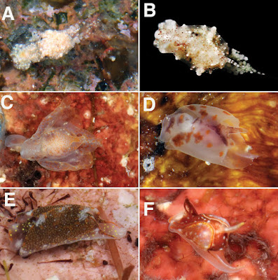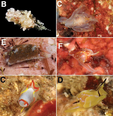[Mollusca • 2017] Like A Bat Out of Heaven: the Phylogeny and Diversity of the Bat-winged Slugs (Heterobranchia: Gastropteridae)  | (B) Gastropteron minutum sp. nov., Maui, Hawai’ian Islands, photo by Cory Pittman. (C) Gastropteron multo sp. nov., Mabini, Philippines.