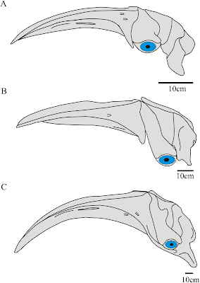 | Figure 13: Reconstructions of balaenid crania in left lateral view, showing relative position of the orbit and eyeball (in blue) with arching of the rostrum. (A) Morenocetus parvus. (B) Balaenella brachyrhynus. (C) Eubalaena australis. The rostrum in (B) is depicted as preserved in the original specimen. |