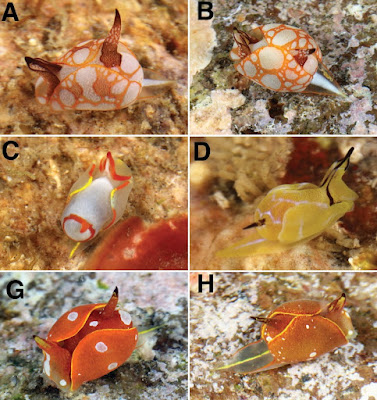 | Living animals. (A) Siphopteron nakakatuwa sp. nov., partaype, CASIZ 199114, Tingloy, Philippines. (B) Siphopteron nakakatuwa sp. nov., holotype, NMP 041185, Tingloy, Philippines. (C) Siphopteron makisig sp. nov., holotype NMP 041186, Calatagan, Philippines. (D) Siphopteron dumbo sp. nov., NMP 041187, Puerto, Galera, Philippines. (G) Siphopteron flavolineatum, holotype, NMP 041184, Tingloy, Philippines. (H) Siphopteron flavolineatum, paratype, CASIZ 199132, Tingloy, Philippines. Photos by T. Gosliner. |