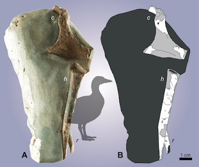 Systematic paleontology Avialae Gauthier 1986 Ornithothoraces Chiappe and Calvo 1994 Ornithuromorpha Chiappe and Walker 2002 Ornithurae Haeckel 1866 sensu Chiappe Vegaviidae Agnolín et al. 2017 Maaqwi cascadensis gen. et sp. nov. Etymology: The generic name, Maaqwi, is derived from “ ma’aqwi”, the Coast Salish word meaning “ water bird”. The specific name, cascadensis, reflects provenance in the Cascadia region of western North America. Holotype: RBCM.EH2008.011.01120 consists of a concretionary mudstone nodule containing a right coracoid, as previously described by Dyke et al. [18]. However, at the time of initial description, the specimen had not been prepared and only the dorsal face of the coracoid was visible [18, Fig 2A]. The acrocoracoid appeared to be missing and only the broken ends of the three associated long bones were visible. Subsequent mechanical preparation of the coracoid revealed that its head was everted ventrally and had been buried within the matrix. Further preparation revealed central portions of three wing elements; a humerus, ulna and radius (Fig 2). The specimen is housed within the RBCM. Locality: RBCM.EH2008.011.01120 was recovered from a coastal outcrop of the upper Campanian Northumberland Formation exposed on the northwestern shore of Hornby Island, British Columbia. Diagnosis: Coracoid compact, polygonal in profile, with the omal portion approximately one third of the medial length. Coracoid shaft a stout, flat bar. Coracoid and humerus robust, highly pachyostotic. Conclusions Maaqwi cascadensis appears to represent a lineage of Cretaceous marine birds distinct from either Ichthyornithes or Hesperornithiformes. Instead, it appears to be closely allied with—or perhaps part of—crown Aves. The wings are reduced, inconsistent with soaring, and instead suggest a bird specialized for fast cruising flight over water. The thickness of the walls of the bones suggest that it was a diver but the wings are not modified for underwater propulsion. Instead, it was most likely a foot-propelled diver, although it may have made occasional use of its wings for steering underwater. Phylogenetic analysis suggests affinities with Vegavis iaai, which has recently been reinterpreted as a foot-propelled diver, taking its place along side other advanced ornithurines specialized for foot-propelled diving within the Vegaviidae including Australornis lovei, Neogaeornis wetzeli, and Polarornis gregrorii. Clearly, additional fossil material is needed to better understand the affinities and ecology of these Late Cretaceous–early Paleogene marine birds. Sandy M. S. McLachlan, Gary W. Kaiser and Nicholas R. Longrich. 2017. Maaqwi cascadensis: A Large, Marine Diving Bird (Avialae: Ornithurae) from the Upper Cretaceous of British Columbia, Canada. PLoS ONE. 12(12); e0189473. DOI: 10.1371/journal.pone.0189473 | 11:59a |