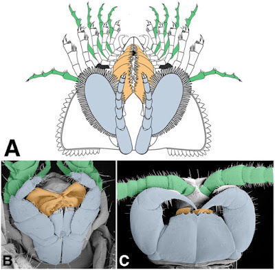 | Fig. 7 Convergences in head anatomy and morphology between Habelia (a) and selected mandibulates, in this case Ianiropsis sp. (Malacostraca: Isopoda; b; © Buz Wilson, Australian Museum) and Henicops washpoolensis (Myriapoda: Chilopoda; c; image provided by G. Edgecombe). Colours highlight the morpho-functional correspondence between sensory appendages (exopods in Habelia vs. antennae in mandibulates; green), masticatory appendages (gnathobases in Habelia vs. mandibles and maxillae in mandibulates; orange) and complimentary appendages aiding in food manipulation (seventh head appendage in Habelia vs. maxillipeds in mandibulates; blue). Note that masticatory appendages in Henicops are hidden by the large coxosternites of the maxillipeds |