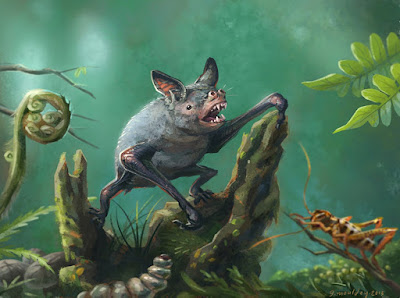 | An artist's impression of a New Zealand burrowing bat, Mystacina robusta, that went extinct last century. The new fossil find, Vulcanops jennyworthyae, that lived millions of years ago in New Zealand, is an ancient relative of burrowing or short-tailed bats.
