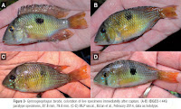 | Figure 3- Gymnogeophagus taroba, coloration of live specimens immediatelly after capture. (A-B) IBIGEO-I 449, paratype specimens, 87.8 mm, 79.8 mm. (C-D) MLP uncat., Říčan et al., February 2014, data as holotype. |