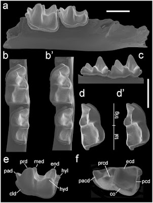 | Figure 1 Vulcanops jennyworthyae gen. et sp. nov., Bannockburn Formation, St Bathans, Central Otago, New Zealand. Lower dentition. CM 2013.18.790, holotype, left dentary fragment containing m2-3. (a) Buccal view; (b–b’) stereopair, occlusal view; (c) lingual view m2-3. NMNZ S.52078, paratype, right m1. (d–d’) Stereopair, oblique occlusal view; (e) buccal view; (f) occlusal view.