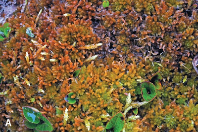 | FIGURE 8. Sphagnum incundum in field surface view. A: The type collection including selected holotype and isotypes. Collected in Ivujivik, Quebec, Canada, in intermediate, slightly sloping arctic fen.