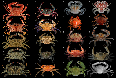 | Figure 3: Representative putative symbiotic Thalamitinae species. (A) Caphyra loevis (UF 39060); (B) Lissocarcinus cf. laevis (UF 39136; New Caledonia); (C) Lissocarcinus holothuricola (UF 30182; Marquesas); (D) Lissocarcinus orbicularis (UF 23972; Moorea); (E) Zygita murinae, comb. nov. (UF 36721; Farasan Banks); (F) Trierarchus woodmasoni, comb. nov. (UF 40079; Guam); (G) Trierarchus cf. cooperi sp. A, comb. nov. (UF 16023; Moorea Is.); (H) Trierarchus cf. cooperi sp. B, comb. nov. (UF 40100; Guam); (I) Trierarchus rotundifrons, comb. nov. (UF 40067; Guam); (J) Trierarchus squamosus, comb. nov. (USNM 102963; Bikini Atoll; preserved specimen, grayscale, left frontal margin damaged). Photographs (A–C, F, H–J) by Nathaniel Evans; photographs (D, E, G) by Gustav Paulay. |