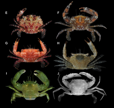 [Crustacea • 2018] Molecular Phylogenetics of Swimming Crabs (Portunoidea Rafinesque, 1815) supports A Revised Family-Level Classification and suggests A Single Derived Origin of Symbiotic Taxa  | (E) Zygita murinae, comb. nov. (UF 36721; Farasan Banks); (F) Trierarchus woodmasoni, comb. nov. (UF 40079; Guam); (G) Trierarchus cf. cooperi sp. A, comb. nov. (UF 16023; Moorea Is.); (H) Trierarchus cf. cooperi sp. B, comb. nov. (UF 40100; Guam); (I) Trierarchus rotundifrons, comb. nov. (UF 40067; Guam); (J) Trierarchus squamosus, comb. nov. (USNM 102963; Bikini Atoll; preserved specimen, grayscale, left frontal margin damaged).