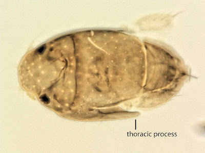 Biology: Unknown, but almost certainly a parasitoid. The torn wing membrane is reminiscent of other phorid flies that shed their wings when entering a social insect colony. It seems likely that the greatly enlarged forelegs are used to clutch a host, upon which the small, rounded body would appear similar to that of many phoretic mites.