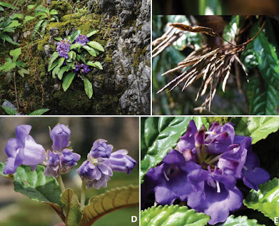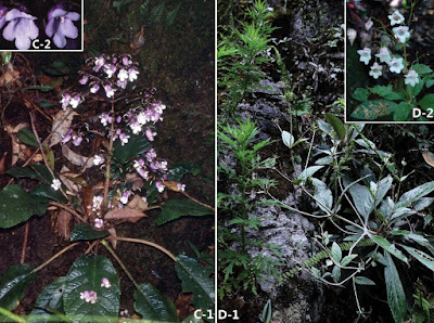 | C P. martinii (Lévl.) Burt C-1 flowering habit C-2 corolla face view D P. glutinosa (Handel-Mazzetti) K. Y. Pan D-1 plant in habitat D-2 inflorescense, showing corolla face view. |
