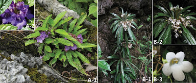 | A: Paraboea wenshanensis X.Hong & F.Wen. A-1 plant in habitat A-2 corolla face view B P. angustifolia Yan Liu & W.B. Xu B-1 habitat B-2 flowering habit, B-3 corolla face view |