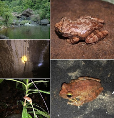 Figure 4. Habitats of Rhacophorus jarujini in Thailand: (A) Wang Wern Waterfall, Yoddom WS, Ubon Ratchathani province; (C) R. jarujini clinging on cave wall ca. 1 m from the ground; (D) R. jarujini on a tree at Phu Jong-Na Yoi NP, Ubon Ratchathani province |