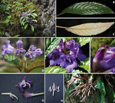 | Figure 2. Paraboea wenshanensis X.Hong & F.Wen. A Habitat B Adaxial surface view of leaf blade C Abaxial surface view of leaf blade D Cyme with flowers, showing wide campanulate E Frontal view of corolla F Calyx lobes G Opened corolla for showing stamens and pistil H Pistil with calyx lobes and stamens, showing anthers and strongly geniculate filaments I Infructescence with many capsules. |