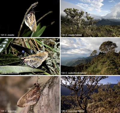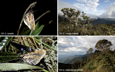 | Figs 131–138. Living specimens and habitats. 131. Callipia rosetta Thierry-Mieg, 1904, ♂, Ecuador, Loja province, Podocarpus National Park, Cajanuma, 2897 m, 26 Mar. 2011. The specimen was attracted to light and benumbed. 132. Elfin forests are a habitat of C. rosetta Thierry-Mieg, 1904 and C. walterfriedlii sp. nov., Ecuador, Loja province, Podocarpus National Park, Cajanuma, 3000 m, 30 Jan. 2013. 133. C. walterfriedlii sp. nov., ♀, Ecuador, Loja province, Podocarpus National Park, Cerro Toledo, 2938 m, 27. Feb. 2013. The specimen was attracted to light and benumbed. 134. Habitat (elfin forest) of C. walterfriedlii sp. nov. at Cerro Toledo. |
