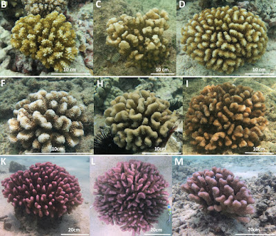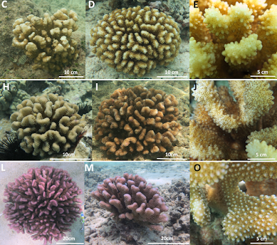 | colonies of Pocillopora spp. from O‘ahu, Hawai‘i; (B–D) Pocillopora ligulata, (F–I) P. meandrina and (K–M) P. eydouxi.