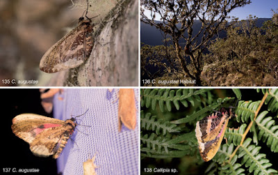 | Figs 131–138. Living specimens and habitats. 135. Callipia augustae sp. nov., ♂, Peru, Cusco province, Wayqecha station, 2900 m, 26 Aug. 2016. The specimen was collected at night, trapped, photographed and released the next morning. 136. Habitat of C. augustae sp. nov. and Callipia sp. near Wayqecha station. 137. C. augustae sp. nov., ♂, Peru, Cusco province, road Wayqecha–Pillcopata, 2284 m, 23 Aug. 2016. The specimen was attracted to UV light and tried to take up fluid (see proboscis). 138. Callipia sp. at Wayqecha station, 4 Sep. 2016. This specimen was attracted to UV light, but escaped into the vegetation when disturbed. |