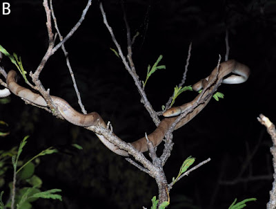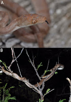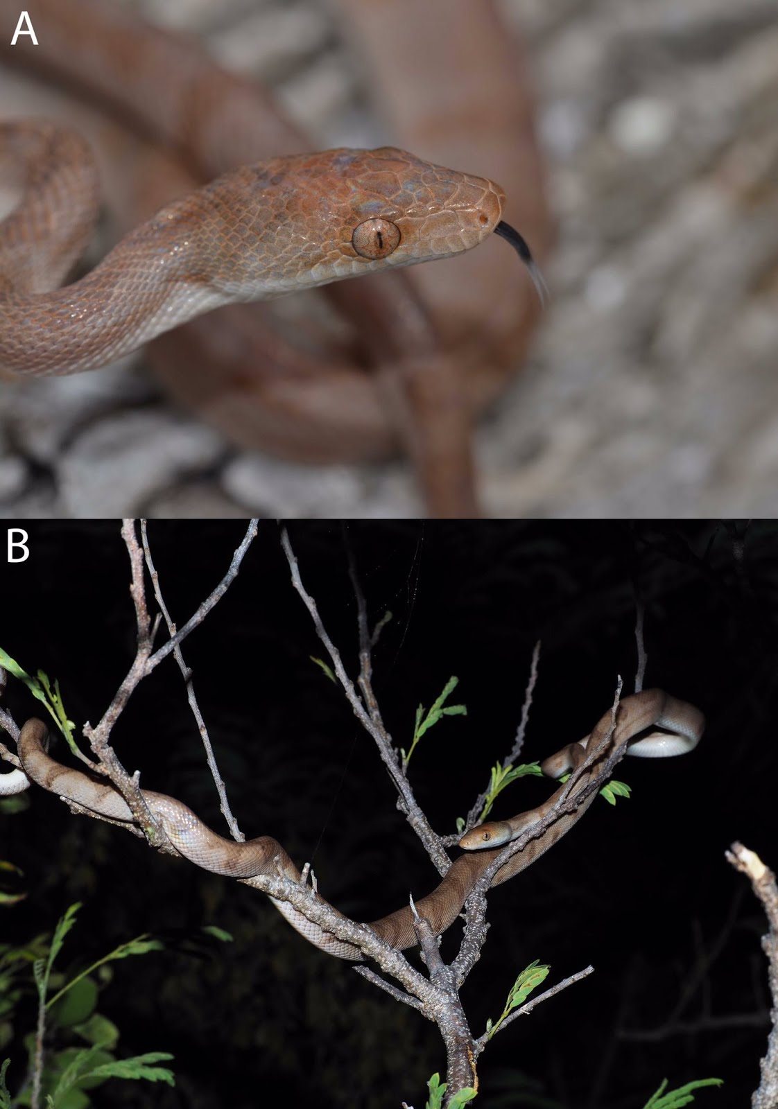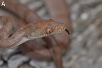 | Figure 6. A, close-up view of the head of a juvenile Chilabothrus schwartzi. Photo by Joseph P. Burgess. B, in-situ photo of a juvenile C. schwartzi as discovered. Photo by Alberto R. Puente-Rolón. |