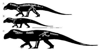 | FIGURE 3. Skeletal reconstructions showing the majority of the elements preserved in, and relative sizes of, each of the three partial skeletons referred to Mandasuchus tanyauchen, gen. et sp. nov. A, NHMUK PV R6792; B, NHMUK PV R6793; C, NHMUK PV R6794.