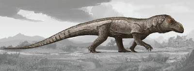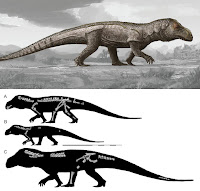Life Reconstruction: A new life reconstruction, prepared by Mark Witton, is presented here (Fig. 27). The reconstruction is based on the proportions of the largest known specimen (NHMUK PV R6794), and missing body parts (primarily the skull) were based largely on the closely related taxon Prestosuchus.