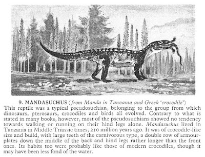 ABSTRACT The diverse assemblage of extinct archosaur species known from the Manda Beds of Tanzania has provided key insights into the timing and tempo of the early part of the archosaur radiation during the Middle Triassic. Several archosaur specimens were collected from the Manda Beds in 1933 by F. R. Parrington, and three of these were subsequently described and made the basis of a new genus, ‘ Mandasuchus,’ in a 1956 doctoral dissertation. However, this important fossil material was never formally published, and >60 years later ‘ Mandasuchus’ and ‘ Mandasuchus tanyauchen’ remain nomina nuda, despite frequent references to them in the literature. Here, we provide a detailed description of this material, provide the first formal diagnosis of Mandasuchus tanyauchen, gen. et sp. nov., and assess its phylogenetic position. The holotype of M. tanyauchen includes a well-preserved partial postcranial skeleton and fragmentary cranial remains. Four referred specimens include two partial skeletons, consisting primary of postcranial remains, a partial maxilla that was previously assigned to the dinosaur clade Saurischia, and a well-preserved astragalus and calcaneum that may belong to the holotype individual. Mandasuchus tanyauchen is diagnosed by a unique combination of character states, as well as by two possible autapomorphies (ascending process of maxilla thin and compressed from anterolateral to posteromedial; femur with distinct pit lateral to the distal-most expression of the posteromedial tuber). Our phylogenetic analysis recovered M. tanyauchen within Paracrocodylomorpha, as the sister taxon to all other sampled members of Loricata.  | FIGURE 1. Reconstruction of Mandasuchus and accompanying caption commissioned for the Brooke Bond Picture Card album on ‘Prehistoric Animals’ (Charig and Wilson, 1971). twitter.com/ButlerLabBham |