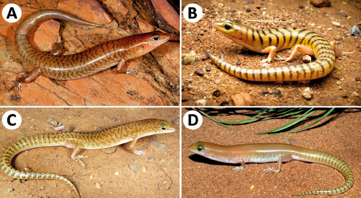Fig. 2. Comparison of body habitus and colouration pattern in narrow-banded Eremiascincus occurring in Western Australia. (A) E. rubiginosus sp. nov. from Duck Creek, Western Australia. (B) E. intermedius from West MacDonnell National Park, Alice Springs, Northern Territory. (C) E. musivus from Dampier, Western Australia. (D) E. pallidus from Exmouth, Western Australia.