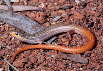 | FIG. 2. Austroablepharus kinghorni, type species for the genus, with characteristic stripes and an orange tail; Durham Downs, Queensland (Image: Steve Wilson). |