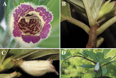 | Alsobia baroniae L. E. Skog & Barrie. —A. Corolla face showing spotting in corolla tube and on limb. —B. Erect stem apex showing opposite leaves of equal size. —C. Side view of mature corolla showing ventral pouch. —D. Habit with lateral stolons. |
