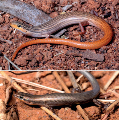 | FIG. 2. Austroablepharus kinghorni, type species for the genus, with characteristic stripes and an orange tail; Durham Downs, Queensland FIG. 1. Proablepharus reginae showing a drab brown, relatively uniform pattern; Tennant Creek, Northern Territory