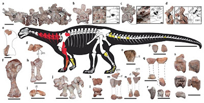 | Fig. 1: Skeletal anatomy of Ingentia prima gen. et sp. nov. from the Quebrada del Barro Formation, northwestern Argentina. a–k, Holotype (PVSJ 1086). l–s, Referred material (PVSJ 1087). a–d, Mid-posterior cervical vertebrae, C5–C10 articulated series (a), close up of the pneumatic fossa with internal subfossae on the centrodiapophyseal fossa (cdf)26 of C8 (b) and C9 (c), and a complex of subfossae on the prcdf26 of C10 (d). e, Right partial scapula. f–i, Right forelimb: humerus (f), and the radius and ulna in proximal (g) and anterior (h) view, and distal articulation (i). j, Right manus in plantar view. k,l, Metacarpal I in proximal (k) and dorsal (l) view. m,n, Radius and ulnae with respective proximal ulna: right radius-ulna (m) and left radius-ulna (n) in posterior view. o, Left proximal end of fibula. p–r, Right partial pes: distal tarsal III–IV in proximal view (p), metatarsal I and II in dorsal view (q) and isolated phalanges (r). s, Four anterior caudal vertebrae and a distal one (bottom left).