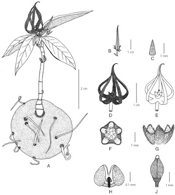 Recognition: Brachystelma ananthapuramense is closely allied to B. naorojii P. Tetali et al., but differs by having a much smaller habit, 4 – 5 cm (vs 30 – 55 cm in B. naorojii), corolla lobes uniformly linear, 1.5 – 2.5 cm long (vs triangular at base, c. 1 cm long in B. narojii), cage globular (vs cage conical in B. narojii) and staminal corona lobes pubescent and not exceeding the coronal cup (vs staminal corona lobes glabrous and exceeding the coronal cup in B. naorojii).