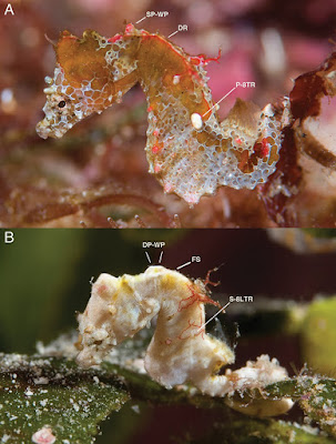 | Figure 7. Comparison of live specimens of A Hippocampus japapigu photographed off Hachijo-jima Island, Japan (Richard Smith), and its most similar congener B Hippocampus pontohi photographed off Tomia Island, southeast Sulawesi, Indonesia (Richard Smith). Note the differences in the anterodorsal area of the trunk in H. japapigu vs. H. pontohi: single vs. double pair of bilaterally paired wing-like protrusions behind the head, raised dorsal ridge vs. laterodorsal flat surface, and large and prominent vs. small eighth lateral trunk ridge spine. Abbreviations: SP-WP, single pair of bilaterally paired wing-like protrusions; DP-WP, double pair of bilaterally paired wing-like protrusions; DR, raised dorsal ridge; FS, flat dorsal surface; P-8LTR, prominent eighth lateral trunk ridge spine; S-8LTR, small eighth lateral trunk ridge spine. |