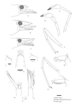 | Fig. 3.Caridina variabilirostris sp. nov., showing the variation in rostrum length related to the altitude (a– c), drawings made from different specimens. a, m–n. ♂, cl 3.5 mm (MNHN-IU-2018-244). a. Rostrum. m. First pleiopod. n. Second pleiopod. b. ♀, cl 5.6 mm, rostrum (MNHN-IU-2018-252). c, j, o. ♀, cl 4.0 mm (MNHN-IU-2018-253) c. Rostrum. j. Uropodial diaeresis. o. Eggs. d–i, k. ♀, cl 3.5 mm (MNHN-IU-2018-250). d. First pereopod. e. Second pereopod. f. Third pereopod. g. Dactylus of third pereopod. h. Fifth pereopod. i. Dactylus of fifth pereopod. k. Telson. l. ♀, cl 4.3 mm, pre-anal carina (MNHN-IU-2018-256). of third pereopod. h. Fifth pereopod. i. Dactylus of fifth pereopod. k. Telson. l. ♀, cl 4.3 mm, pre-anal carina (MNHN-IU-2018-256). |