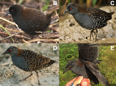 | Fig. 1. (B) Inaccessible Island Rail Atlantisia rogersi (photo: P.G.R.). (C) Dot-winged Crake Porzana spiloptera (photo: Alec Earnshaw). (D) Black Rail Laterallus jamaicensis, which is sister to B and C (photo: Chuck Streker). (E) Galápagos Crake Laterallus spilonota (photo: Jaime Chaves), which is presumed to belong to the same clade as B–D.