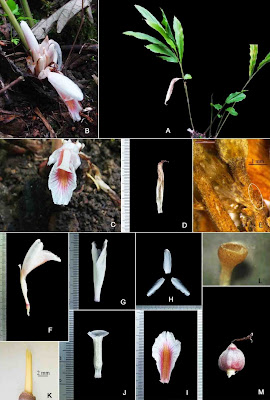 | Fig. 2. Photographs of Amomum nagamiense. A: habit. B & C: inflorescences. D: inner bract. E: bracteole. F: flower. G: calyx. H: corolla lobes. I: labellum. J: stamen. K: ovary with epigynous glands and style. L: stigma. M: fruit. Photos by V.P. Thomas. |