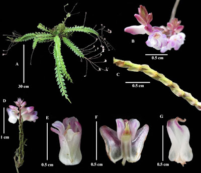 | Fig. 1. Plant and flower of Appendicula cordata Wibowo & Juswara spec. nov. A. Plant; B. Flower, front view; C. Flower bract; D. Inflorescence; E. Flower, ventral view; F. Flower in section; G. Labellum, dorsal view.