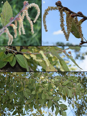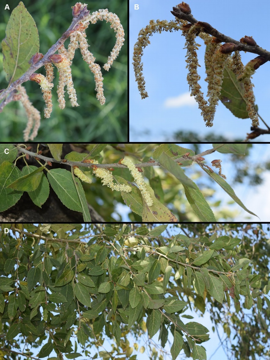 | Fig. 3. Populus primaveralepensis A.Vázquez, Muñiz-Castro & Zuno sp. nov., male individual, Vázquez-García et al. 10106b leg., IBUG. A–B. Two views of same branch with inflorescence past anthesis. C. Inflorescence at anthesis. D. Branch showing leaf variability and venation. Photographs: A. Vázquez. |