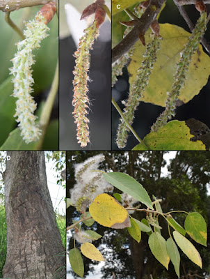 | Fig. 4. Populus primaveralepensis A.Vázquez, Muñiz-Castro & Zuno sp. nov., female individual, Vázquez-García et al. 10106c leg., IBUG. A. Inflorescence at anthesis. B. Inflorescence past anthesis. C. Developing infrutescence. D. Trunk. E. Branch with leaves and dehiscing capsules, showing the whitish pappus of seeds. Photographs: A. Vázquez. |