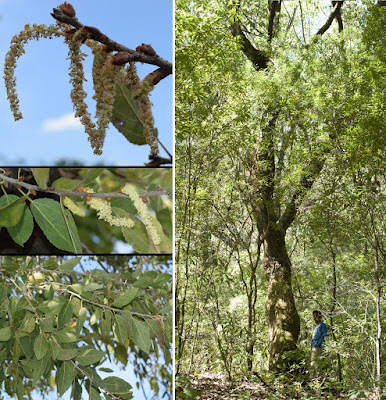 | Populus primaveralepensis A.Vázquez, Muñiz-Castro & Zuno sp. nov. Fig. 3. male individual, Vázquez-García et al. 10106b leg., IBUG. A–B. Two views of same branch with inflorescence past anthesis. C. Inflorescence at anthesis. D. Branch showing leaf variability and venation. Photographs: A. Vázquez. Fig. 2. Tree showing its habit and bark. J. Padilla Lepe, standing next to the tree; photograph: O. Ibarrarán. |