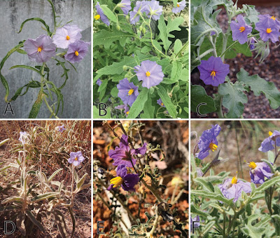 | Figure 2. Closely related species of andromonoecious bush tomatoes included in this study. A Solanum jobsonii B S. watneyi C S. succosum D Solanum plastisexum E S. diversiflorum and F S. eburneum. |
