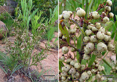 | FIGURE 1. Gymnosporia sekhukhuniensis, on the farm Hoogland 38JT, between Lydenburg (Mashishing) and Roossenekal in Mpumalanga province, South Africa. A. Plant with fruit; in natural habitat, amongst rocks of norite. B. Almost mature fruit.
