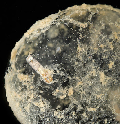 | An Olea hensoni slug, left, feeds on the eggs inside a gelatinous mass laid by an unknown marine invertebrate. The jelly-like mass is generally an effective protection against predators -- but not this slug.