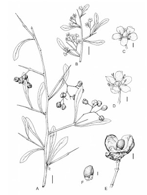 | FIGURE 2. Gymnosporia sekhukhuniensis. A. Leafy branchlet with fruit. B. Twig with male flowers. C. Female flower. D. Male flower. E. Dehisced capsule with seed. F. Seed, with basal aril. Scale bar = 10 mm (A & B), 1 mm (C, D & F) and 2 mm (E). A from Winter 2585, B from Winter 2932, C from Schmidt 845, D from Stalmans 695, E & F from McMurtry 12408. Artist: Daleen Roodt. |