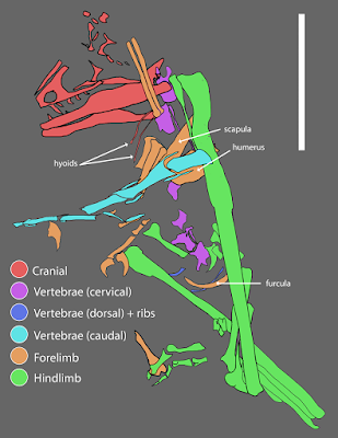 | Figure 3: Reconstructed quarry map of WYDICE-DML-001. Association of skeletal elements assembled from 3D scans of specimen blocks prior to final mechanical preparation. Scale bar = 6 cm. |