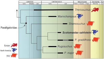 ABSTRACT New discoveries at the Arlington Archosaur Site (AAS), a Cenomanian (Late Cretaceous) locality in north‐central Texas, are filling gaps in our knowledge of mid‐Cretaceous Appalachian ecosystems, which remain poorly characterized. The AAS is notable because it preserves a diverse crocodyliform record. As seen in other sites that preserve four or more crocodyliform taxa, the species present at the AAS exhibit different snout shapes and body sizes, indicating that this high diversity of sympatric species was likely sustainable due to niche partitioning. Here we describe Scolomastax sahlsteini gen. et sp. nov., a new species of crocodyliform from the AAS, currently known from a partial right mandibular ramus. This species differs from other crocodyliforms in possessing features associated with durophagy or omnivory, including a shortened mandible, reduced tooth count, heterodonty, a dorsally expanded surangular, and enlarged attachments for jaw adductor muscles. Our phylogenetic analysis places this new taxon within Eusuchia as a member of Paralligatoridae and sister taxon to Paralligator gradilifrons. Scolomastax sahlsteini extends the record of paralligatorids into the Late Cretaceous of North America. This discovery represents the first appearance of this clade on the poorly known landmass of Appalachia, supporting a biogeographic connection between North America and Asia in the Early Cretaceous prior to completion of the Western Interior Seaway. However, relationships among other endemic crocodyliforms and tree instability within Paralligatoridae suggest further analysis is needed to resolve phylogenetic and biogeographic relationships